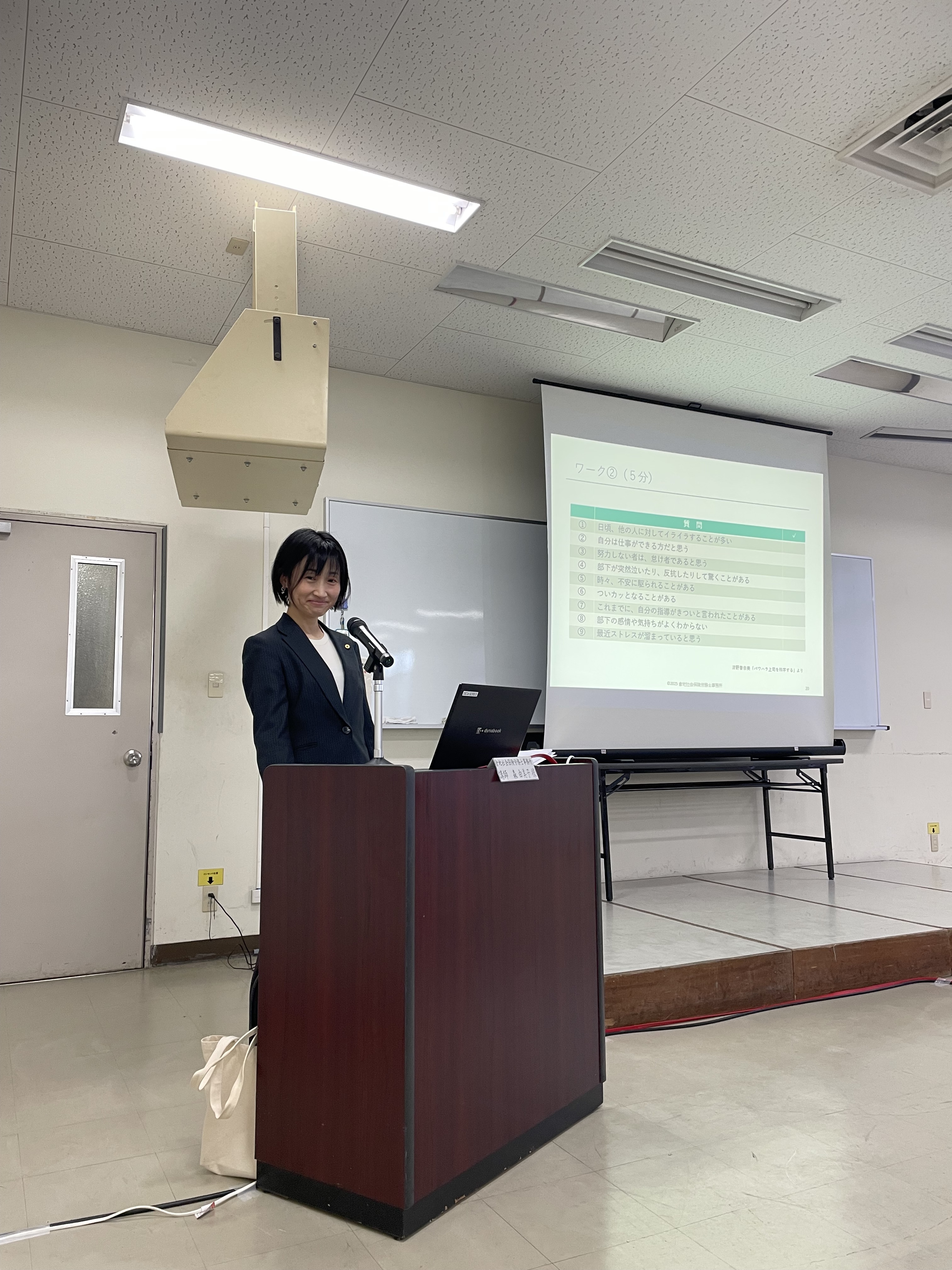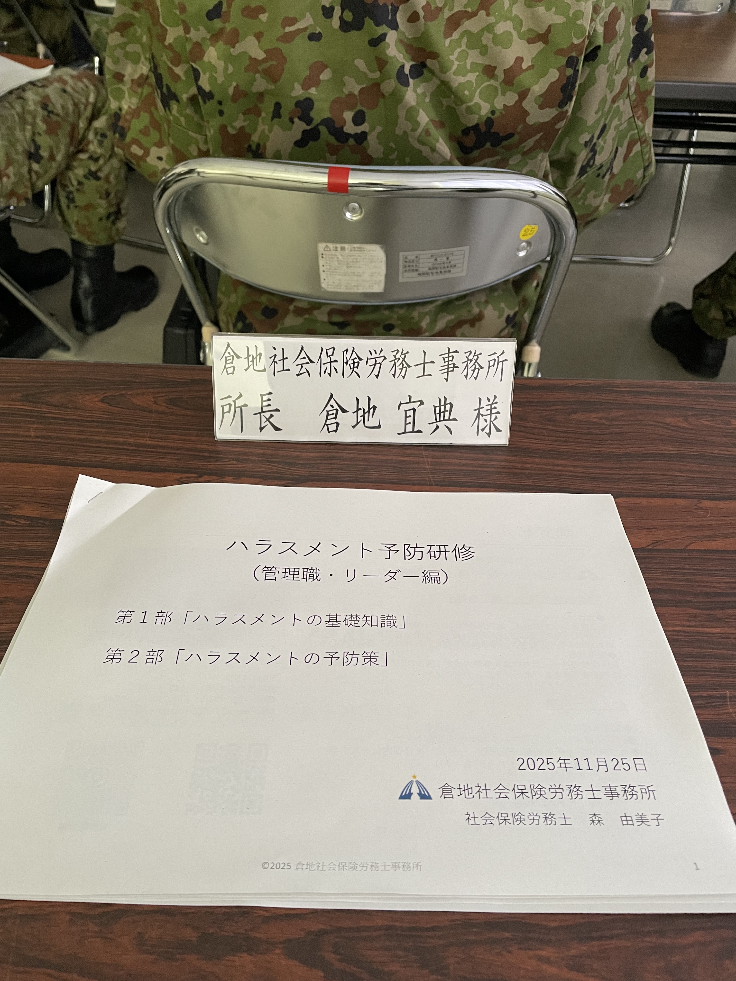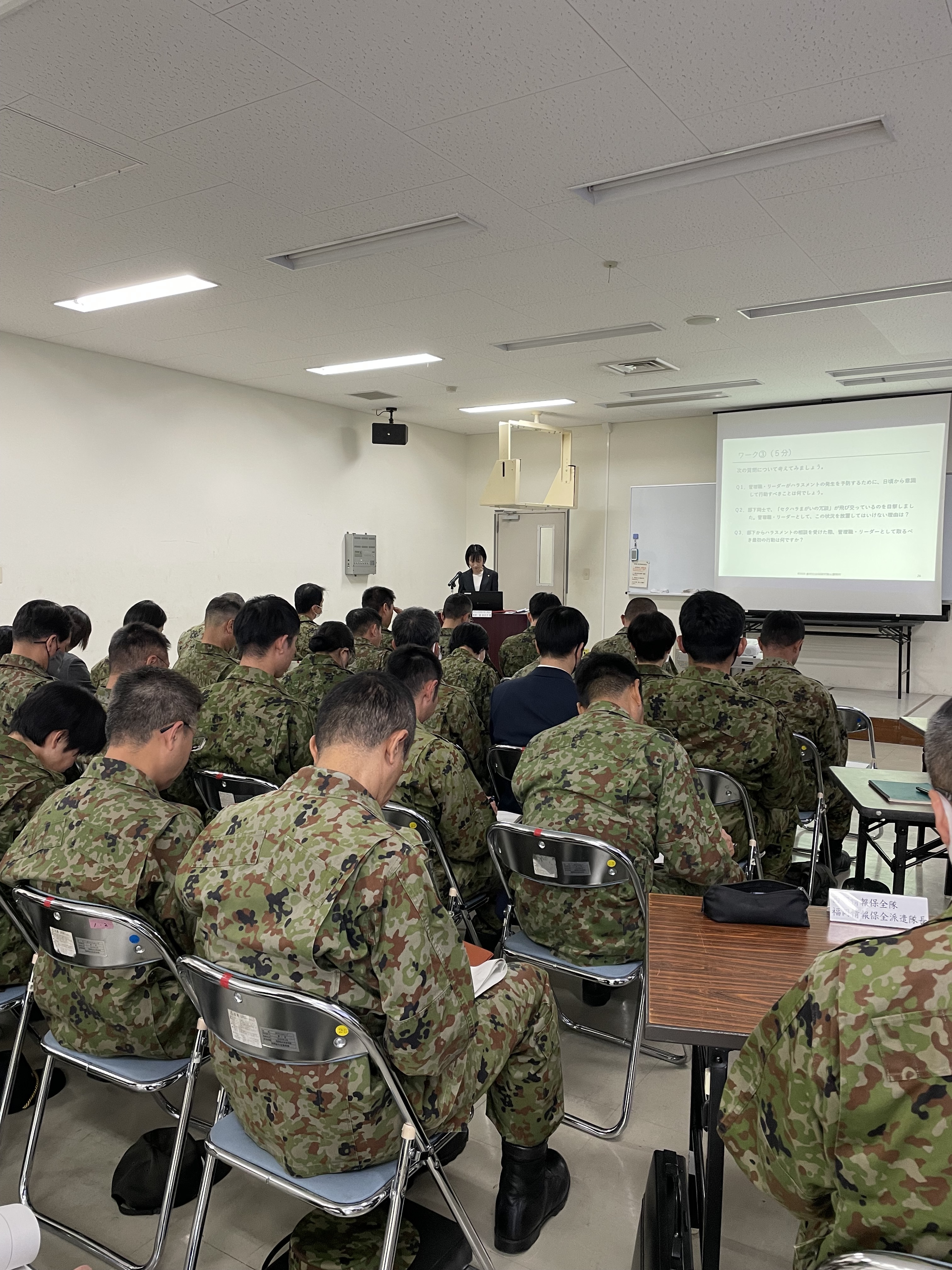 自衛隊様でハラスメント予防研修の講師を務めました。 2025.12.03 皆さまこんにちは。社労士の倉地です。先日、弊事務所の副所長森社労士が、陸上自衛隊福岡駐屯地様にて、ハラスメント予防研修(管理職・リーダー編)の講師をさせていただきました。普段、弊事務所は顧問先の企業様を中心に、数多くのハラスメント研修を実施していますが、今回、ご縁をいただき、初めて自衛隊で研修をさせていただきました。研修には幹部の方、約50名が参加されました。前半は、「ハラスメントの基礎知識」と題して、パワハラ、セクハラの定義やハラスメントの類型についてを、そして後半は、「ハラスメントの予防策」と題して、指導とハラスメントの違いや、ハラスメントにあたらない指導方とは?についてお話しさせていただきました。また、途中3回のワークも取り入れて、一方的に聴くだけの研修ではなく、参加型の研修としました。自衛隊という組織は、明確な階級・上下関係が存在する組織であり、厳格な規律と指揮系統が、そのまま「命」に直結する特殊な環境にあると認識しています。よって、時には厳しい指導や、強い連携が求められる場面もあるでしょう。しかし、「厳しい指導」と「ハラスメント」の境界線を誤り、隊員の信頼関係や士気を損なってしまえば、それは巡り巡って、組織力や組織任務遂行能力の低下につながりかねません。今回の研修が、隊員の皆様のハラスメント防止への意識改革の「きっかけ」となり、「より強く、より信頼される自衛隊」の実現に直結すればと、心から期待しております。陸上自衛隊福岡駐屯地の皆さま、今回はこのような研修の機会をいただきありがとうございました。最後に、セミナー終了後に緊張から解放されランチする森副所長でした。弊事務所では、ハラスメント予防研修他、各種社内研修の講師を承っております。お気軽にお問い合わせください。 < 忘年会を開催しました!経営者向けセミナー「経営者が知っておきたい!企業型確定拠出年金の基本」を開催しました。 > NEW 2026.01.18 【2026年4月開始】「子ども・子育て支援金制度」のポイント解説 2026.01.16 福岡県民のうどん愛 2025.12.30 2025年もお世話になりました。 2025.12.05 忘年会を開催しました! 2025.12.03 自衛隊様でハラスメント予防研修の講師を務めました。